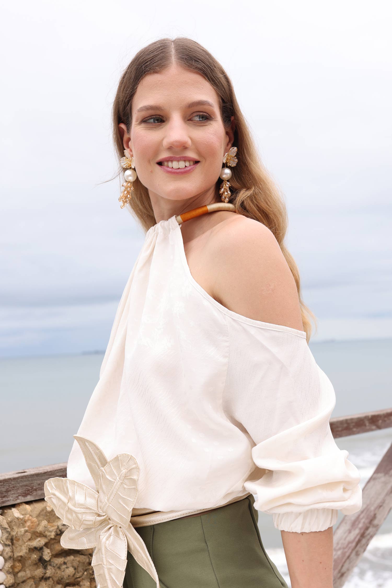 Esta blusa halter blanca combina sofisticación y frescura con un diseño de hombros descubiertos y sutil textura jacquard. Su silueta fluida, escote recogido con detalle dorado y mangas abullonadas crean una armonía perfecta entre lo clásico y lo contemporáneo. Ideal para ocasiones especiales, eventos de día o una cena elegante. El toque final al out fit lo da su cinturón con flor(*no incluye el cinturon*) , que realza la cintura con un aire elegante, delicado y femenino. Una prenda única para mujeres que aprecian el detalle y la elegancia sin esfuerzo.