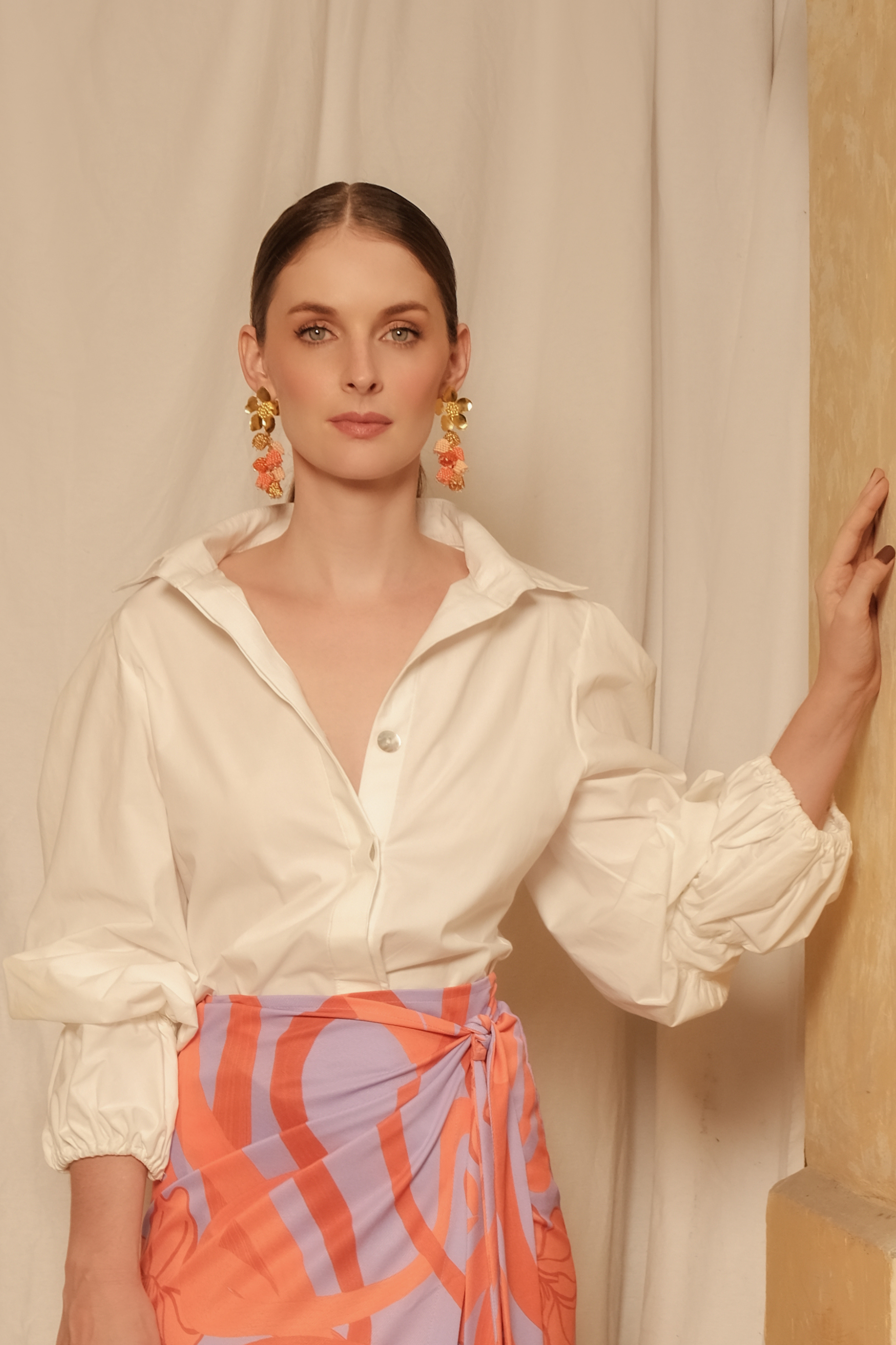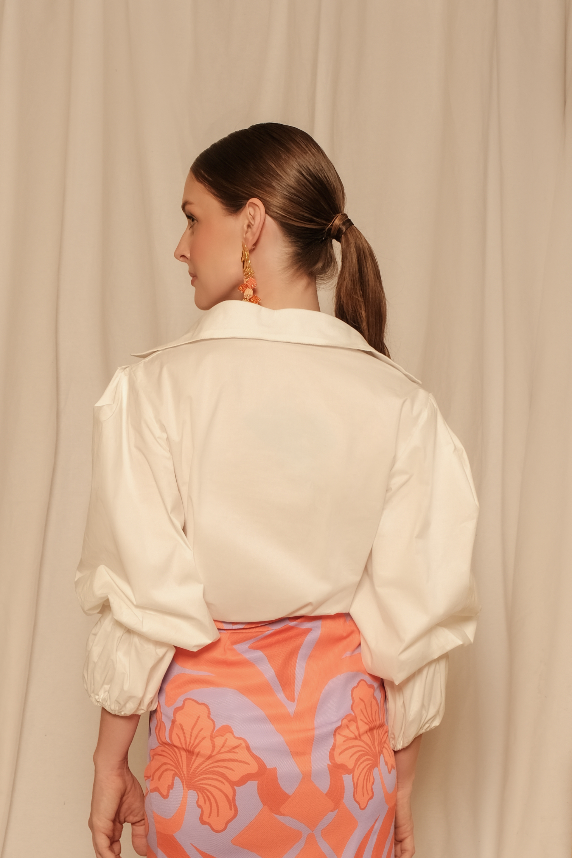 Camisa con manga bombacha, escote en v y botón en frente. Elaborada en 96% algodón y 4% elastano, con la caída ideal para combinar con prendas inferiores estampadas.