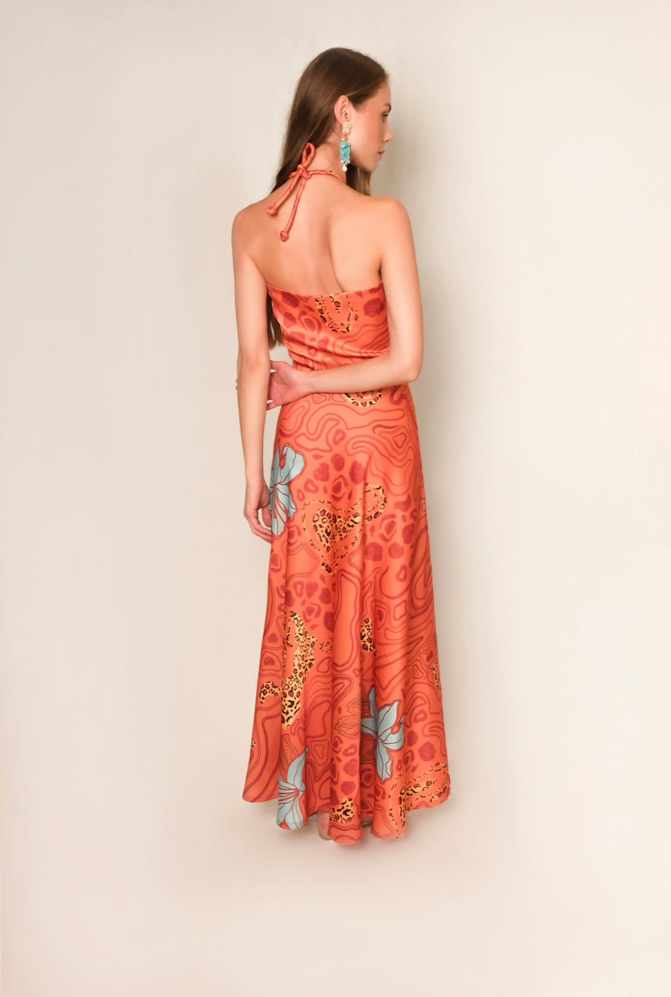 El maxi vestido Dulce Encanto es una oda a la feminidad suave y libre. Su estampado delicado transforma cada movimiento en una escena de ensueño, mientras que el escote estilo corazón/concha realza el busto con sutileza y elegancia. El lazo al cuello tipo halter le da un toque fresco y veraniego, ideal para días especiales o escapadas con estilo.