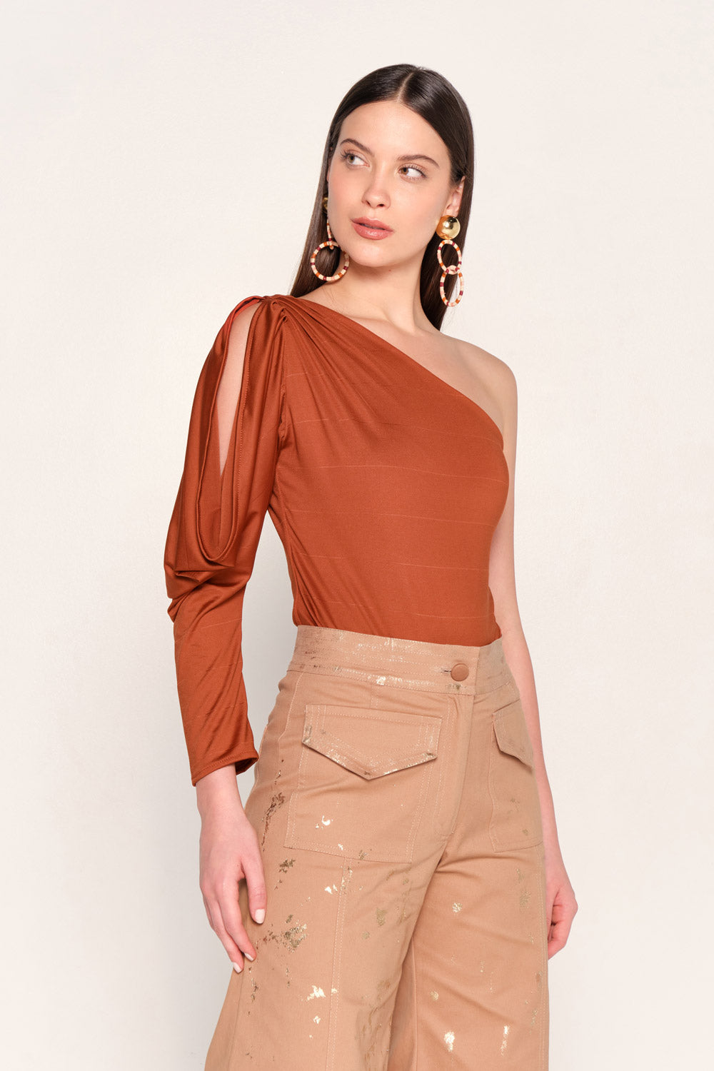 Este elegante body asimétrico es la pieza perfecta para añadir un toque de sofisticación y modernidad a tu guardarropa. Confeccionado en un tejido elástico que se ajusta a la silueta, su vibrante tono ladrillo o terracota lo convierte en el centro de todas las miradas. Es ideal para combinar con pantalones de tiro alto, faldas o jeans.